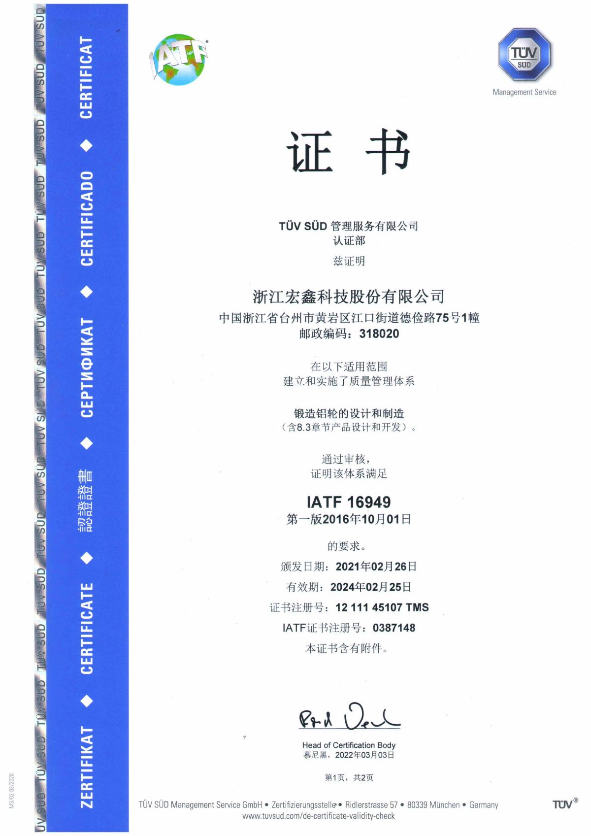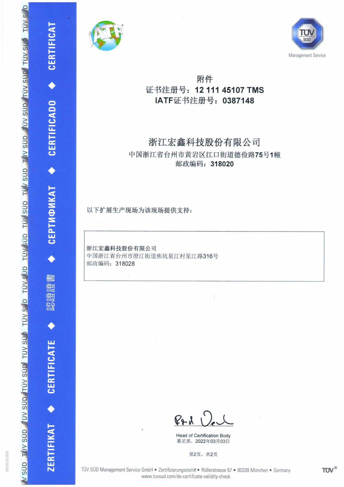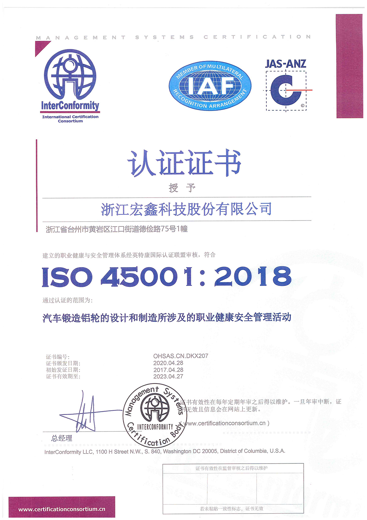 2020年,浙江宏鑫科技股份有限公司成立。