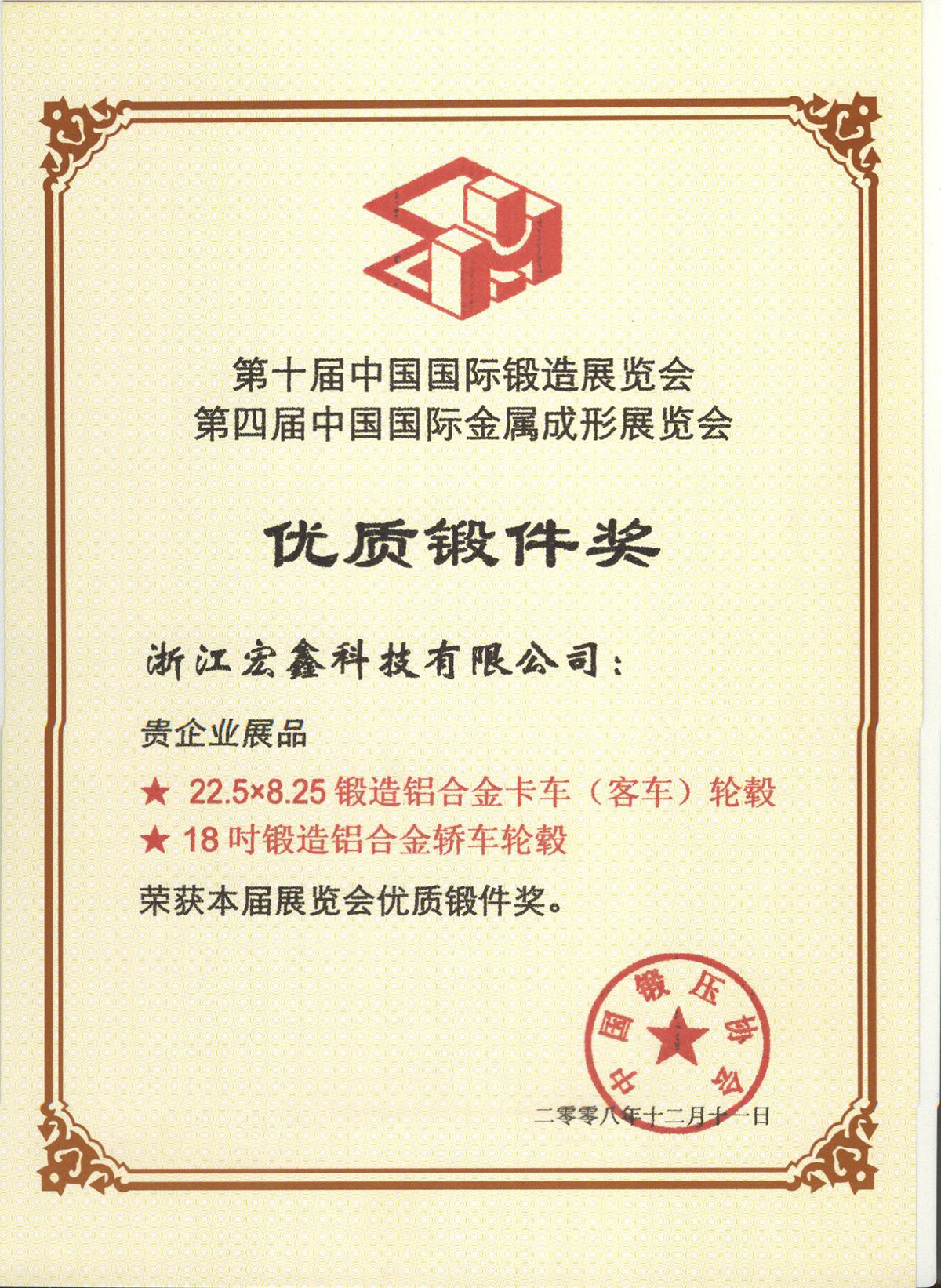 第十屆中國國際鍛造展覽會第四屆中國國際金屬成形展覽會優(yōu)質(zhì)鍛件獎